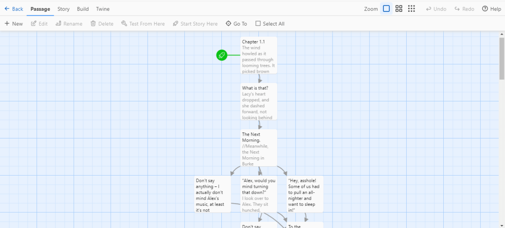 This project is a research and creative project I completed during Digital Storytelling. This project aimed to conduct research on a particular field of digital storytelling and then create our own example of it. I chose to focus on interactive narratives, using academic and professional resources, and utilized Twine to design and program my interactive narrative. The first part of this project is an essay I wrote showing my research and how it connected to the creative example I made. While the actually narrative fiction game I created cannot be linked in this post, screenshots are provide to demonstrate the process of creating and working with software programs new to me, showing my ability to quickly learn and adapt to new processes. This research project shows how I can conduct thorough research and analysis and comprehensively use findings to develop substantive projects.